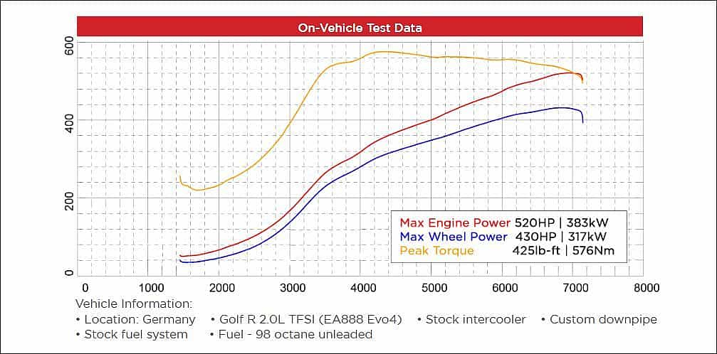 • 550 HP | 410 kW turbo Capability (on-vehicle results 520 HP | 383 kW - with conservative tune)