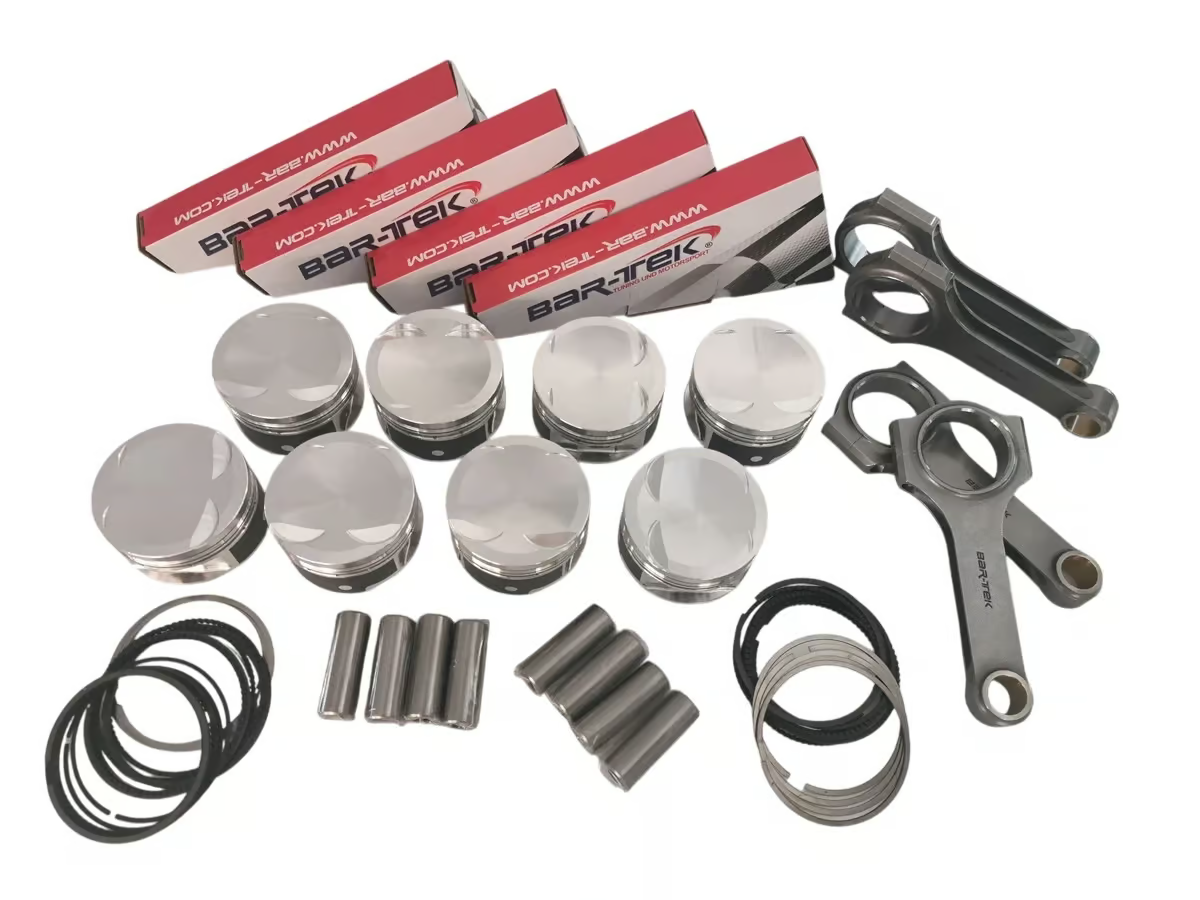 JE Pistons aim for smooth and quiet operation even during cold starts , and utilize a graphite-based anti-friction coating. BAR-TEK® H-beam connecting rods are engineered for extreme loads : they are lightweight yet highly rigid, and distribute loads evenly – improving durability at high cylinder pressures and RPMs.
