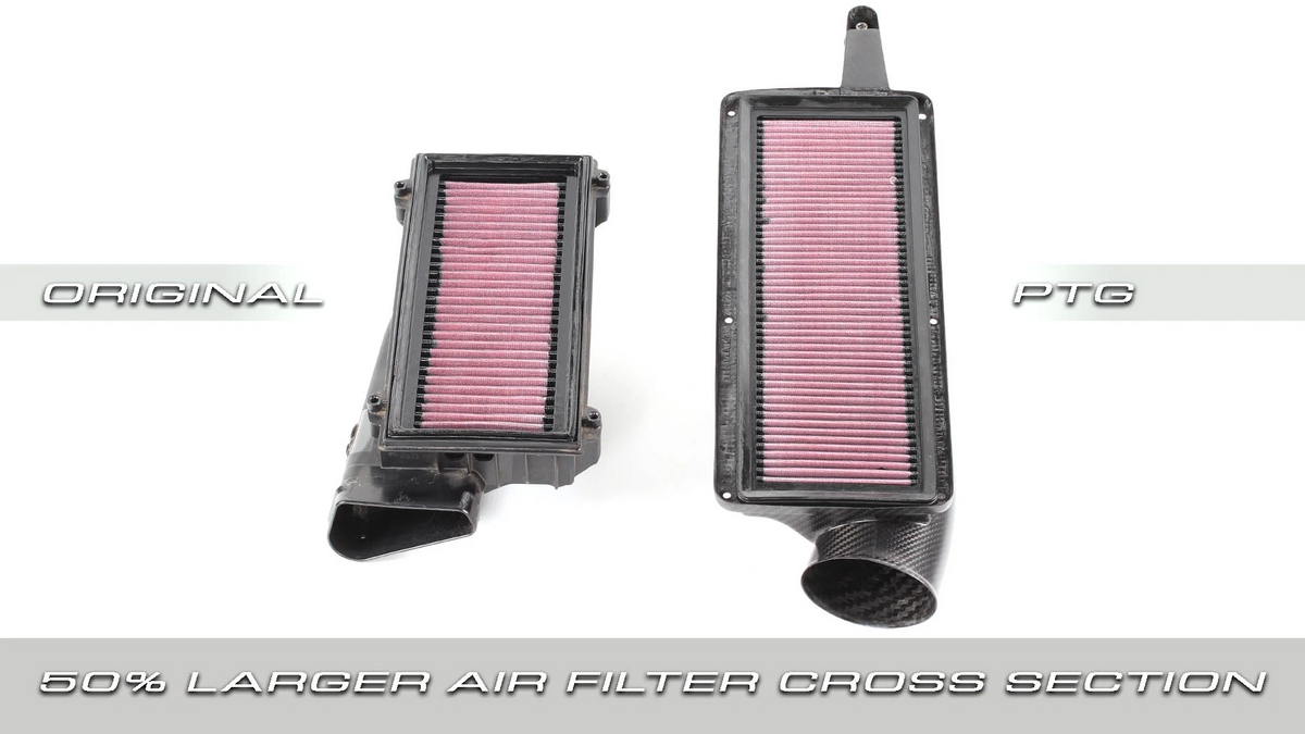 Designed utilizing 3D scan technology and produced completely in aerospace level "prepreg" carbon fiber and hard anodized billet aluminum, these satin finished carbon airboxes are a zero restriction intake system that have substantial gains on vehicles from stock to our PTG-X 1,300HP package.