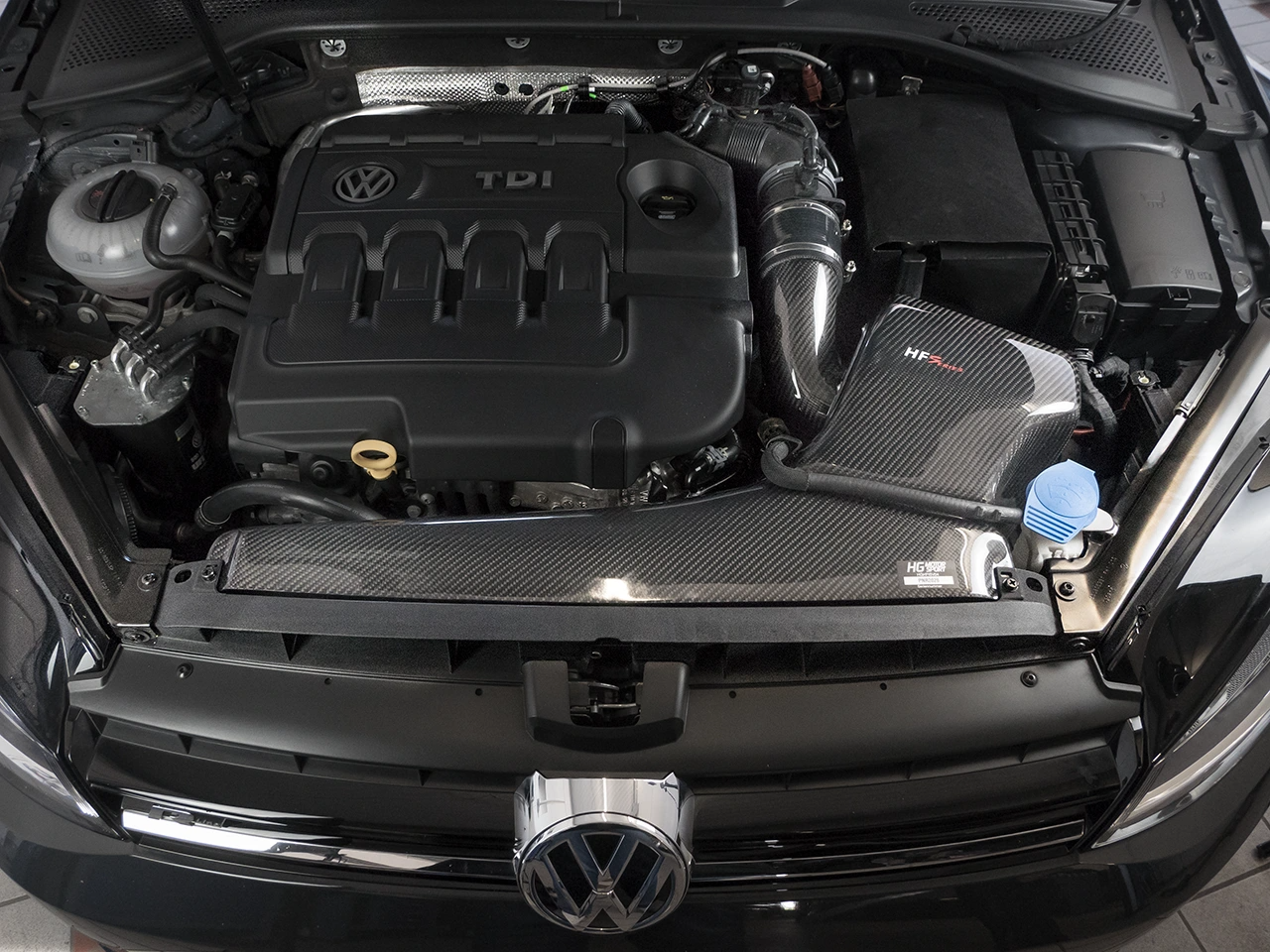 The HFI Carbon Intake is designed for 2.0 TDI Euro 6 engines and is suitable for both standard and tuned engines. The kit replaces the entire original air filter housing and grille air guide section .