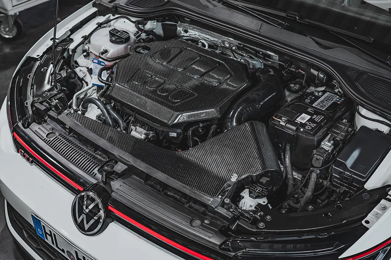 This HF-Series Real Carbon Intake Kit for the Golf 8 models with EA888 Gen.4 engines is the perfect solution for maximum air flow in combination with a perfect look and approval.